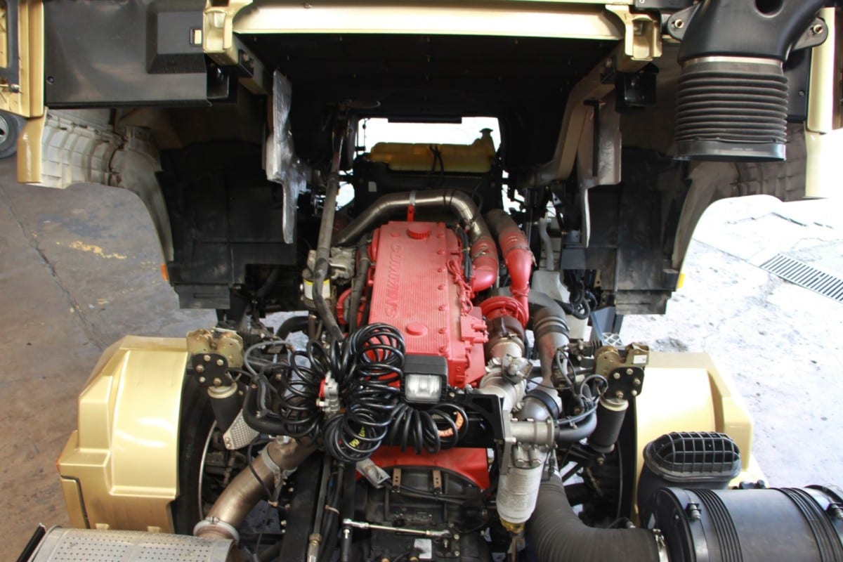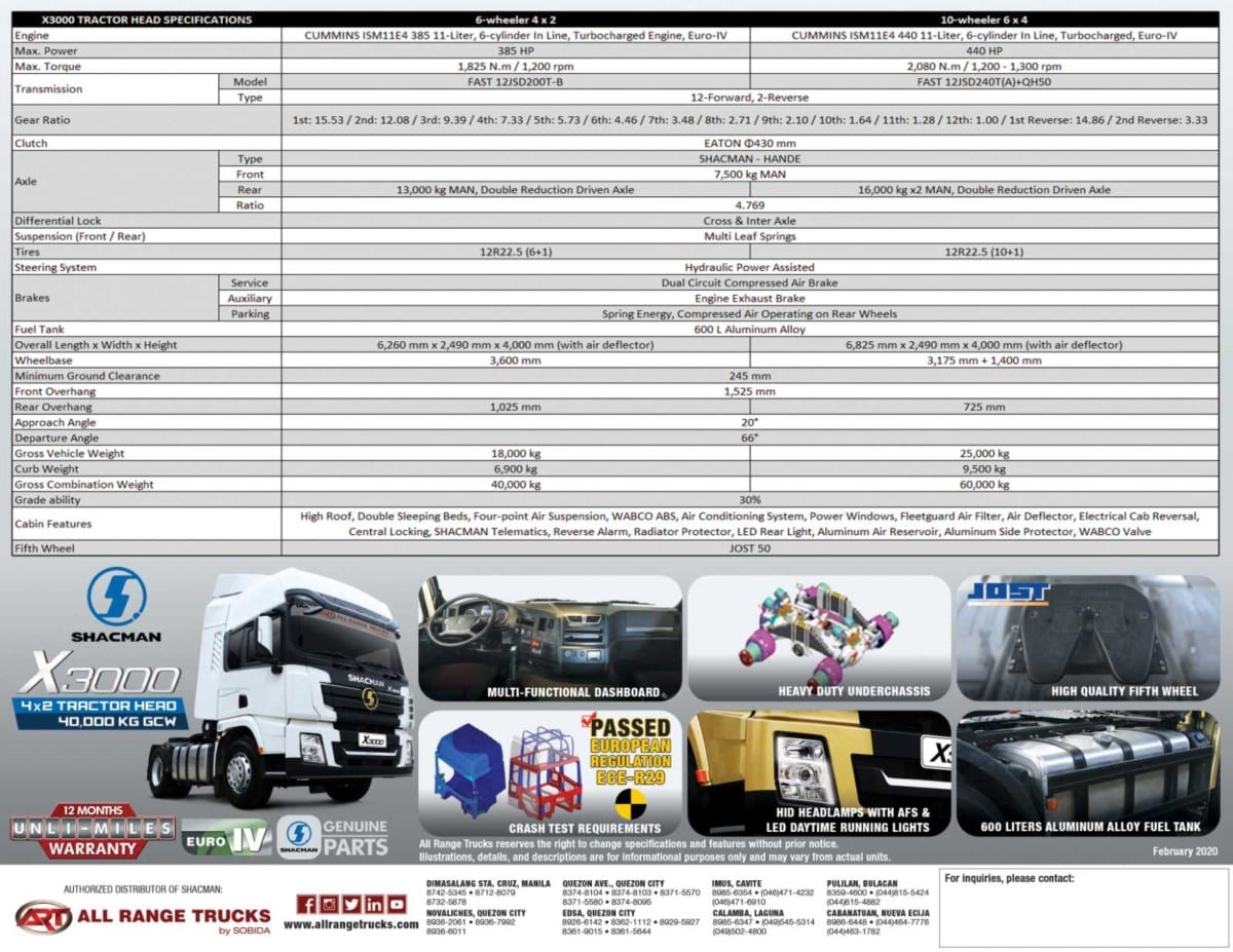 Shacman X3000 SX42564W324C 11-liter CUMMINS ISM CELECT 6-cylinder turbocharged Euro-4 Diesel engine, 440 horsepower, 2,080 N-m/1,200-1,300 rpm torque, 12-speed manual transmission, 10-wheeler 6×4 rear wheel drive, 600 liter aluminum fuel tank, 430 mm diameter EATON clutch, SHACMAN-Hande Axles, 12R22.5 (10+1) tires with rim trim cover, multi-leaf spring suspension, WABCO braking technology, length: 6,825 mm, width: 2,490 mm, height: 4,000 mm, wheelbase: 3,175 mm + 1,400 mm, Gross Vehicle Weight: 25,000 kgs, Curb Weight: 9,500 kgs, Gross Combination Weight: 60,000 kgs, high roof, double sleeping beds, four-point air suspension, air conditioning system, Grammer air suspension driver seat, Jost fifth wheel, Fleetguard air filter, HID headlamps with Adaptive Front Lighting System with LED Daytime Running Lamps, electrical cab reversal, central door locks, Cruise Control, electric heater side mirrors, SHACMAN telematics, WABCO Antilock Braking System (ABS), WABCO valve, Aluminum Air Reservoir, Aluminum Side Protector; 12-months unlimited mileage new vehicle warranty.