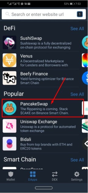 Then Scroll down and tap on PancakeSwap.