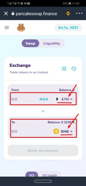 Select ETH to BNB and enter desired amount to swap. The tap SWAP.